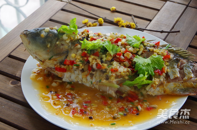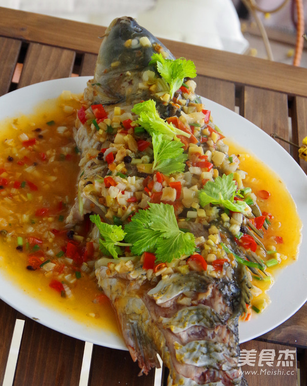 15.将蒸好的鲤鱼放入盘中,淋上鱼香汁即可,最后加点芹菜叶做点缀,非常漂亮哦。(用专门装鱼的盘子盛装会更漂亮哦)