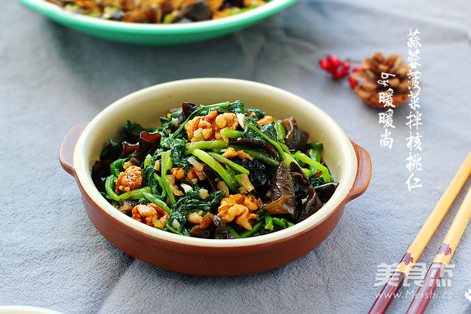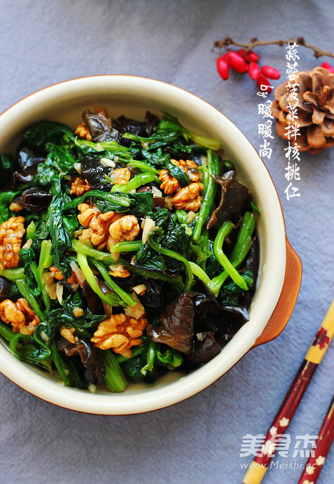 虽说交友不慎,但最近智商严重不够用的确是实情。记得在饭店吃饭经常会吃到一道用新鲜核桃仁做的爽口小菜,但我跑了好几个市场都没买到新鲜核桃仁,只有用从老家带回来的核桃来代替。普通的核桃仁直接食用会有一股涩涩的味道,所以这次我特意低温把洗过的核桃仁烤了10分钟,烤过的核桃仁吃到嘴里会有一种浓的化不开的香气,恍若吃完鹅肝那种意犹未尽的香。当然,如果有耐心的话,还可以将核桃仁用热水煮一下,然后撕掉核桃仁表面那层琥珀色的外皮,这样核桃仁吃起来就完全没有那个酸涩感了。