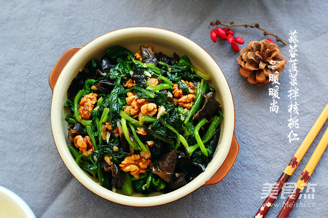 5.往焯木耳的水里加一点盐和几滴食用油,烧开后下菠菜段,汆烫半分钟,然后捞出冲凉后攥干水分备用。