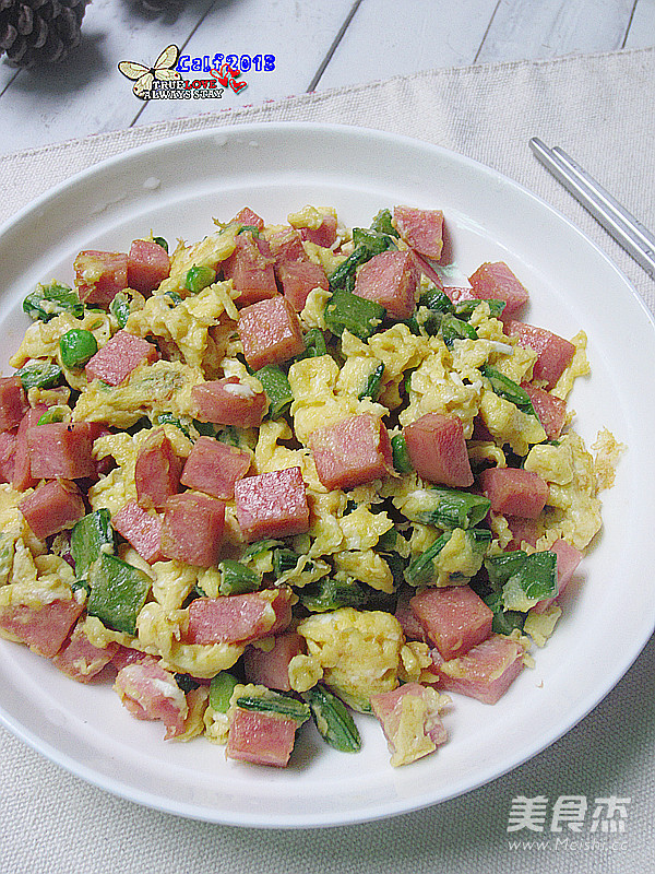 哈哈。。我家的小农场现在盛产是甜豆和生菜!我天天都吃这种菜,吃腻了再转其它的菜菜,今天我拿甜豆加火腿炒了个蛋吃! 主料 甜豆100克 火腿1块 鸡蛋3个 辅料 盐4克 花生油3茶匙 火腿炒蛋的做法 1.准备好食材 2.甜豆去豆筋 3.甜豆洗净,切粒 4.火腿洗净,切粒 5.鸡蛋打出加放少许盐,搅拌均匀 6.热油锅,翻炒甜豆 7.加入少许盐调味 8.甜豆炒香后,加入火腿粒 9.火腿炒熟后,加入蛋液迅速翻炒,至蛋液熟透即可 烹饪技巧 不配甜豆炒也行,配其他菜菜也不错的