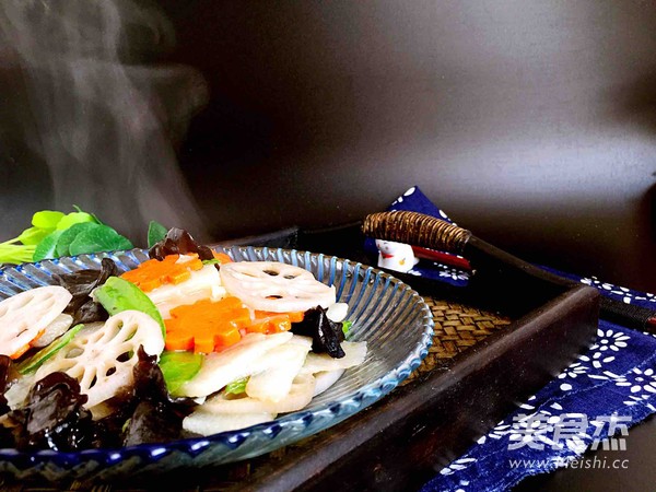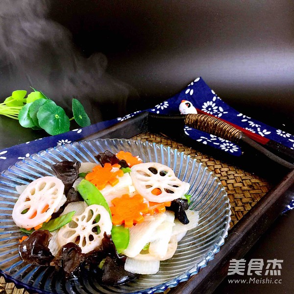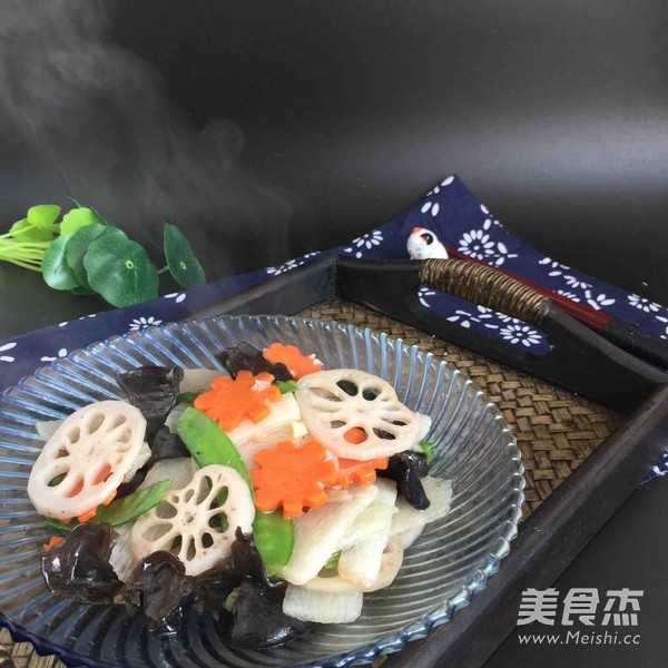莲藕100克 木耳(水发)100克 胡萝卜40克 荷兰豆50克 山药120克