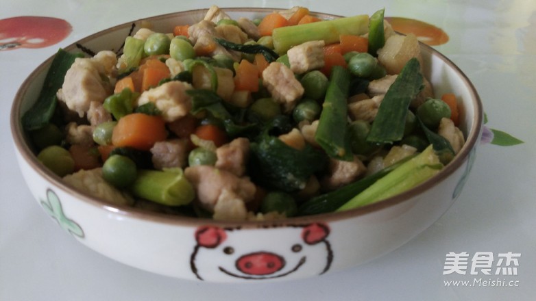 先炒熟猪肉,再将豌豆和胡萝卜以及其他材料一同加水焖也是可以的。