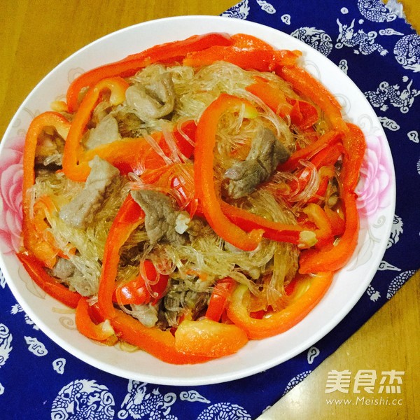喜欢彩椒的甜味 主料 彩椒100克 粉丝50克 瘦肉100克 辅料 油15克 盐5克 蚝油5克 彩椒粉丝的做法 1.起油锅 2.加入肉片,肉片预先用油盐和蚝油腌10分钟 3.加入适量清水 4.加入彩椒,盖上盖,煮3分钟 5.再加入清水 6.加入粉丝(粉丝预先用清水浸泡至软),加入蚝油,煮1分钟边好 烹饪技巧 因为粉丝比较吸水,在煮的时候多放些水