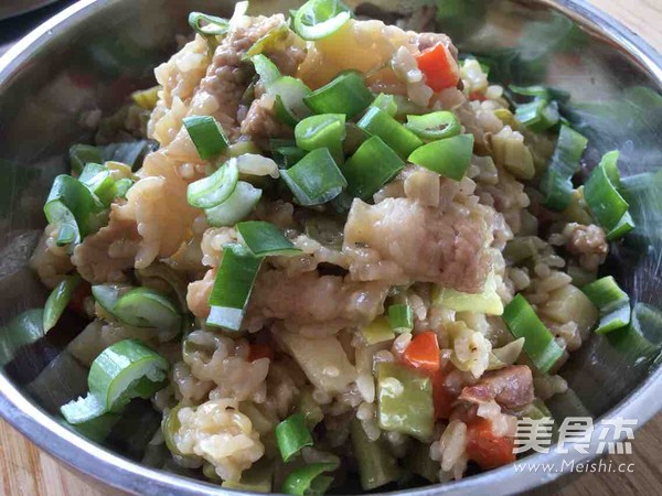 5.倒入大米翻炒,翻炒至所有食材均匀,汤汁收尽即可!