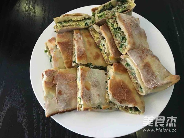 6.把肉馅、韭菜、少许洋葱末和蒜末混合放到饼胚上,打两个鸡蛋与之一起搅拌均匀