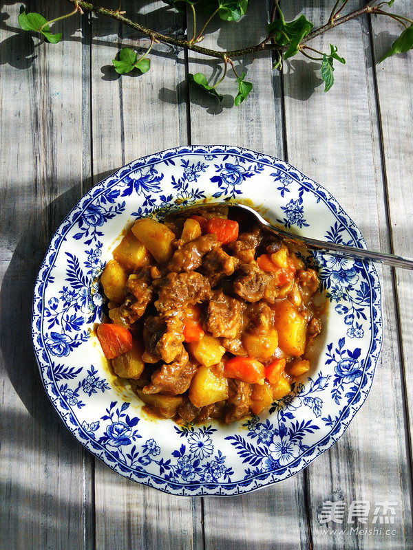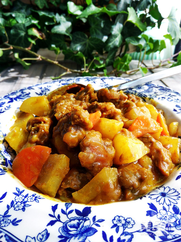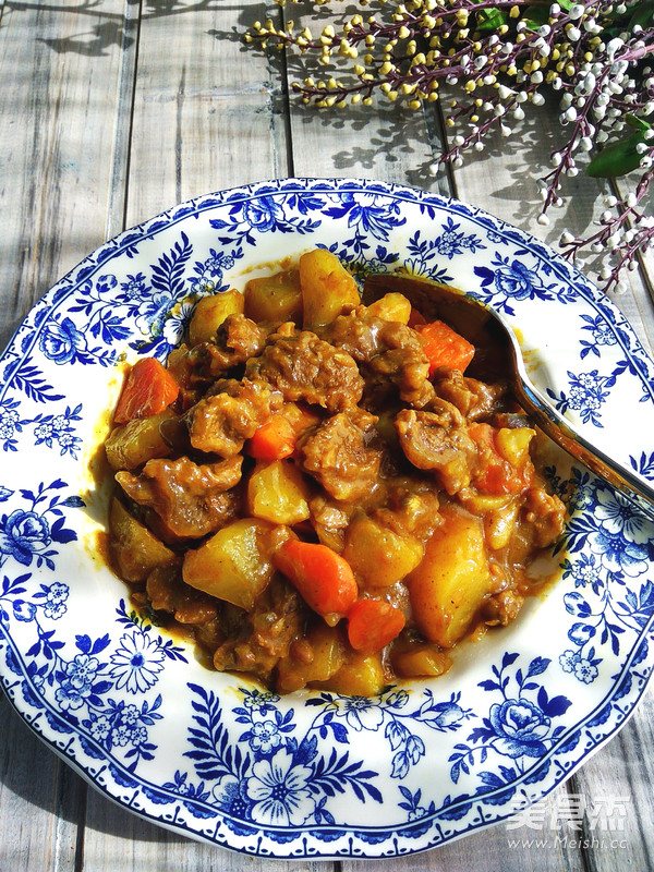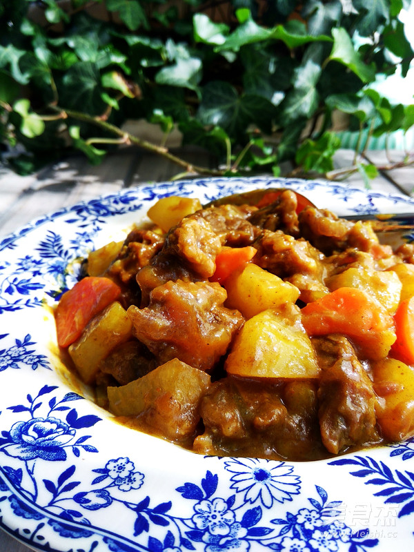 5.电压力锅炖牛腩的同时,洗净削好土豆和胡萝卜,切块备用。 电压力锅完成操作后,将牛腩倒出。同时另备一锅,热锅热油,炒香咖喱粉。