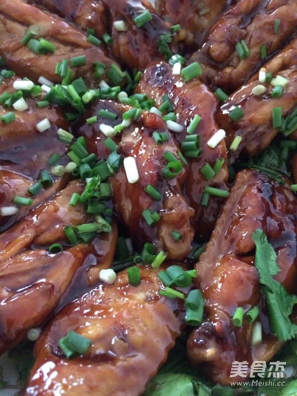 4.将准备好的香菜或生菜放在盘面上,打起鸡翅撒上一点葱、这样就完成了。