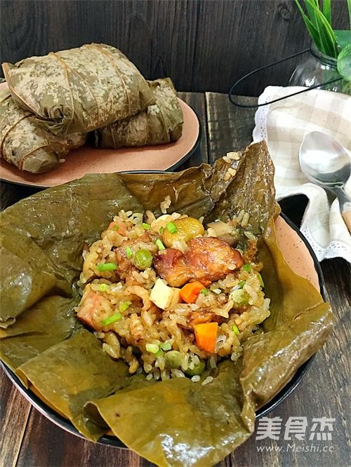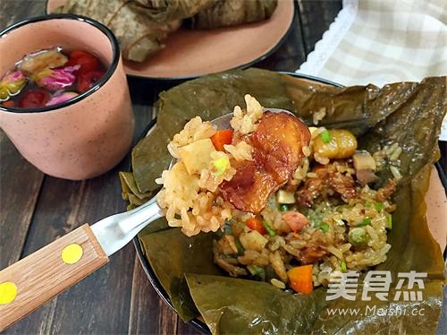 4.把糯米和食材全部放入腌好的鸡块中拌匀,再腌1小时