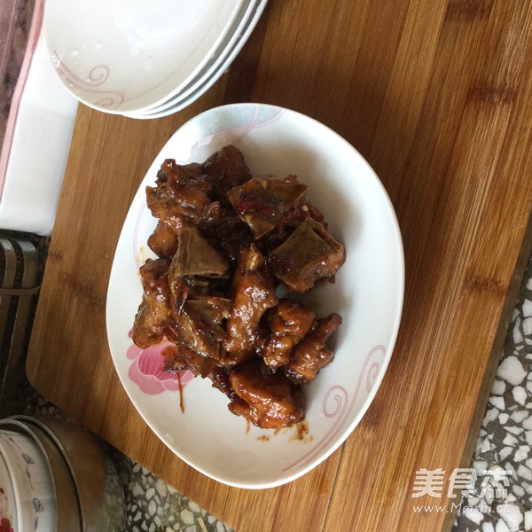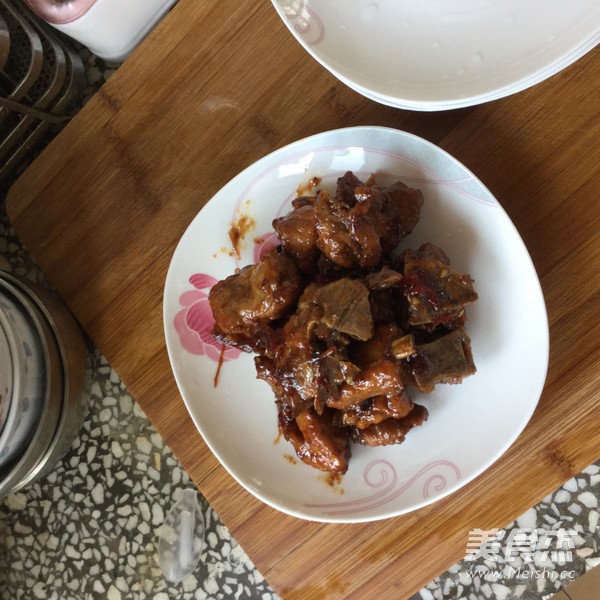 2.锅内加少许油,放若干冰糖,小火炒化直至起泡时将排骨入锅快速翻炒上色,放入葱白,姜片,干辣椒提前用水泡过,八角继续翻炒,加入开水莫过排骨,加入酱油,搅动几下盖上锅盖大火烧开,转小火煮三十分钟,中间搅动两三次