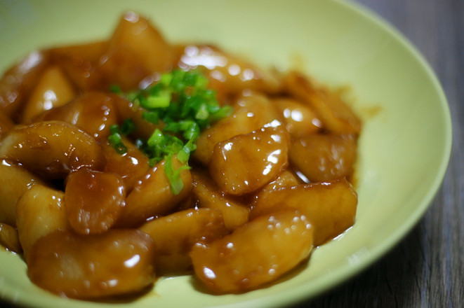 7.当水分即将收干时,将淀粉调成水淀粉加入,翻炒几下,即可出锅,加少许香葱装饰,完成