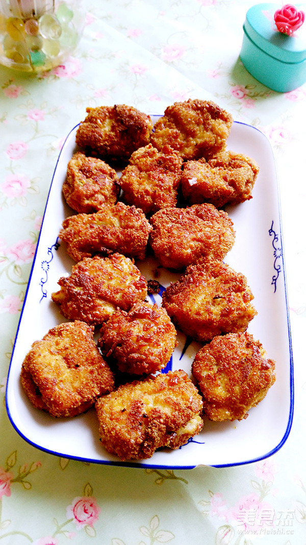 我是利用家中的现成材料去制做的。家里当时没有面包,也不想专程去买,只有馒头,我就将抹茶馒头(浅绿色)烤干了,再弄成屑,唉,弄了好久(因为变干了,手工弄成屑的)功夫不负有心人,我试做了,感觉还挺不错的。这一盘,一餐就吃光光了。