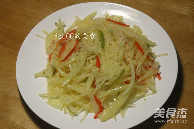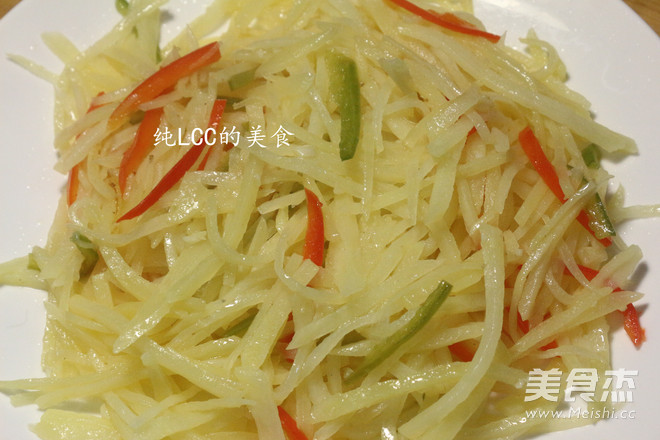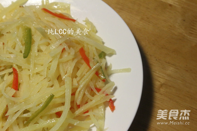 8.最后出锅前加入点芝麻油,这样土豆丝更香,而且色泽也会鲜亮点
