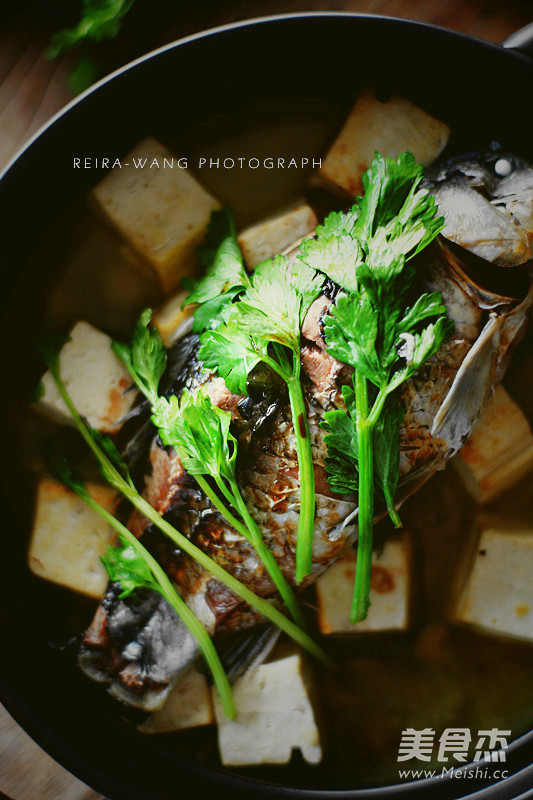 10.鲫鱼身上放上折断的芹菜;盖盖大火煮3分钟,转小火5分钟