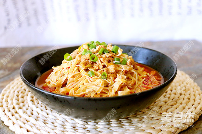 1.千张切丝,金针菇切掉根部洗净,葱姜蒜切成片,小葱切碎,郫县豆瓣酱剁碎;烧开水,水开后放千张丝煮几分钟捞出备用