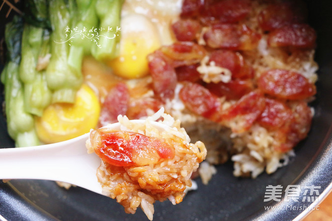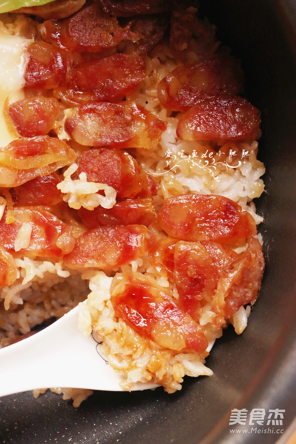 8.米饭煮至水分快干时(大概煮好前15分钟),打开煲盖,铺上腊肠