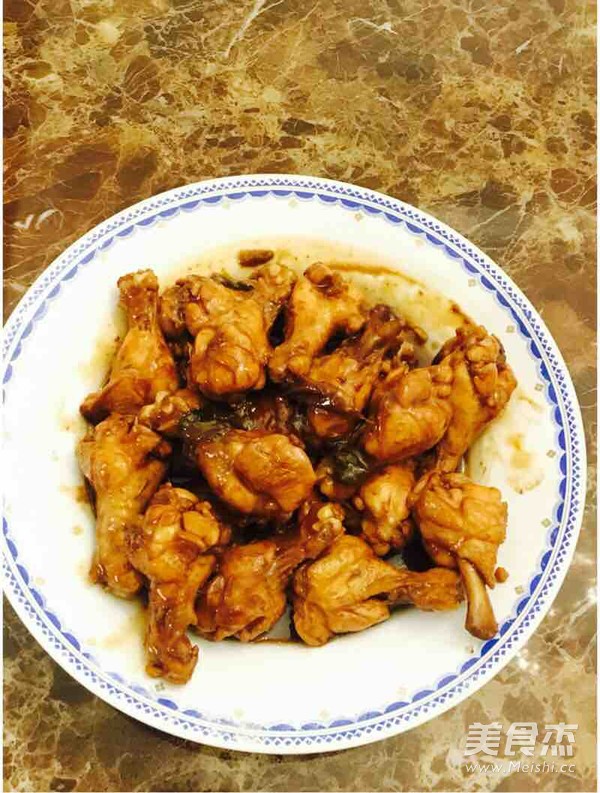 我喜欢吃鸡翅 总是停不下来的吃 主料 鸡翅根1袋 辅料 大料1粒 生抽6勺 老抽2勺 水适量 料酒6勺 盐1勺 糖2勺 姜3片 葱6小段 大朵朵家的红烧鸡翅根的做法 1.鸡肉洗干净 切葱段 姜片 2.锅中倒比炒菜时多一点的油 放一粒大料 三片姜炸香 倒入鸡翅翻炒 3.翻炒至变色后放入葱段 4.放一勺盐 6勺生抽 2勺老抽 6勺料酒 2勺糖 翻炒均匀 5.加适量水 差不多没过鸡翅如图 6.大火烧开 7.盖上盖子 转小火炖25分钟 大火收汁即可