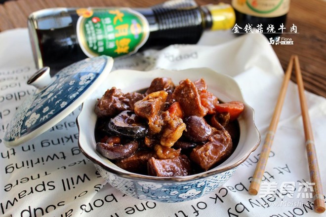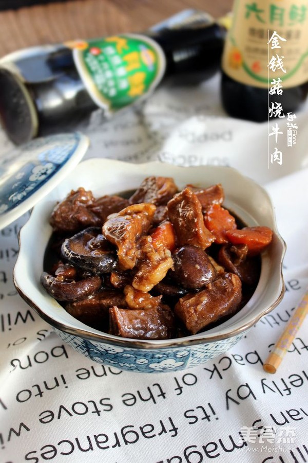 3.炒锅,爆香葱姜蒜,倒入泡发好的金钱菇。烧开,加入炖好的牛肉,可以加入一个切好的胡萝卜,加入蚝油,六月鲜零添加酱油