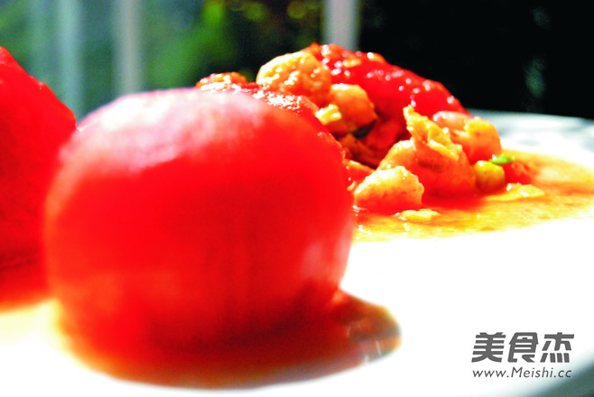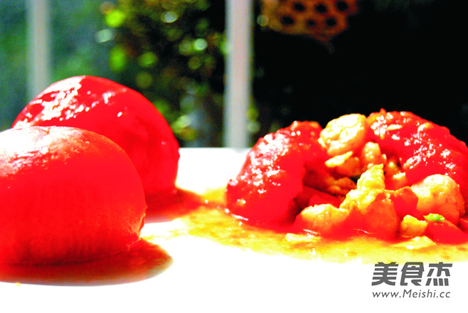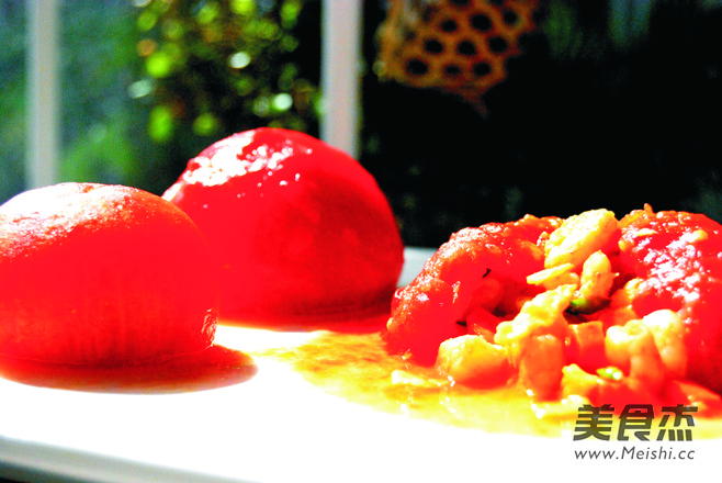 12.装盘后浇上调料汁后,一切二就可以品尝到酸酸甜甜的虾仁炒蛋番茄盅啦