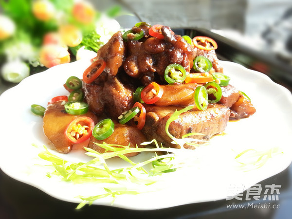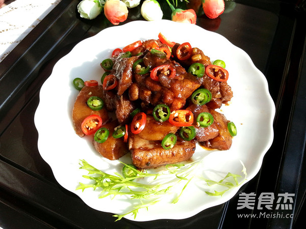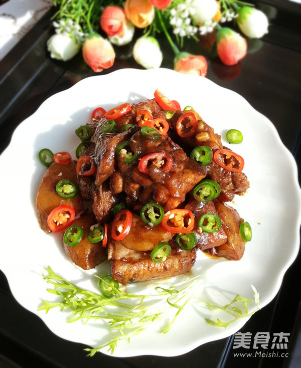 13.待汤汁收浓,关火出锅。(这一步可以加青红椒段翻炒后出锅,我不喜欢吃辣,所以只用青红椒段来做点缀。)