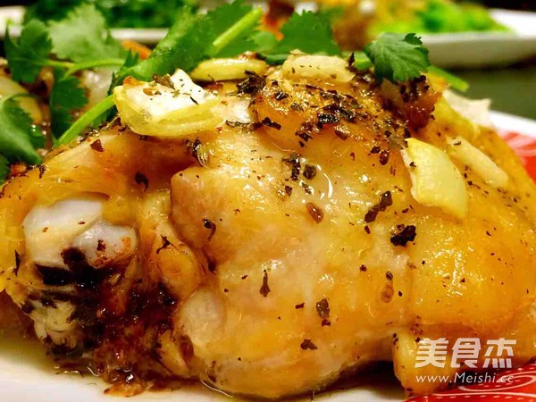 5.将已煎好的鸡块,有皮面朝上,铺上切好的洋葱快;再撒上胡椒粉;