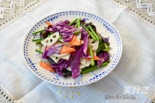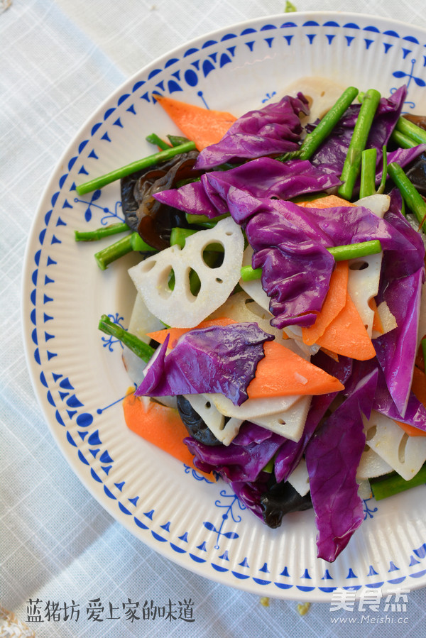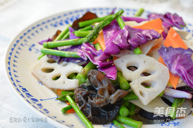 紫甘蓝100克 藕片50克 芦笋50克 胡萝卜30克 木耳30g