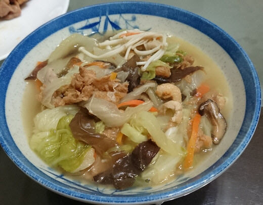 主料:金勾虾1汤匙,香菇3-5朵,木耳1片,鸡蛋2颗,白菜半个,姜丝少许,肉丝适量,金针菇半包(或金针菇罐头)适量