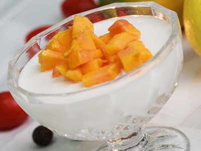 2、在杯子里倒入150毫升酸奶,再加两匙炼奶,搅拌后倒入青木瓜汁搅拌均匀即可;放入冰箱冰冻口感更佳。