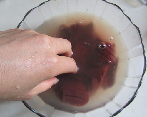 先在火上烧开半锅水,锅开后,在水中加入三小勺花椒,煮三分钟。三分钟后将火关掉,把花椒水倒入碗中放凉,把放凉的花椒水倒在猪腰上泡五分钟。别忘了经络也要全部去除!