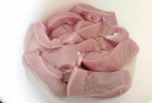 2、将猪腰子剥去薄膜,剖开,剔去筋,切成所需的片或花,用清水漂洗一遍,捞起沥干。