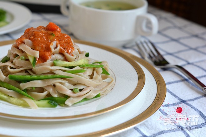 意面虽然老家是意大利,但是现如今也是咱们中国人餐桌上常见的食物了。传统的意面是用硬质小麦做成的,但目前在国内市场上还难觅其踪影。中西合璧可以在面条的做法和吃法体现出来。咱用普通的中筋面粉也能做出意面的感觉来,甚至比意面还能玩出更多的花样来。用面条机压点儿花式面条,再配上自制的意式肉酱。随手取来的蔬菜往里一拌。这一盘有着意面风味的拌面便做好啦!