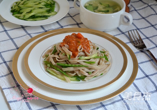 盐2克 荷兰豆1把 黄瓜半根 意式肉酱面适量 火龙果皮糊糊180克