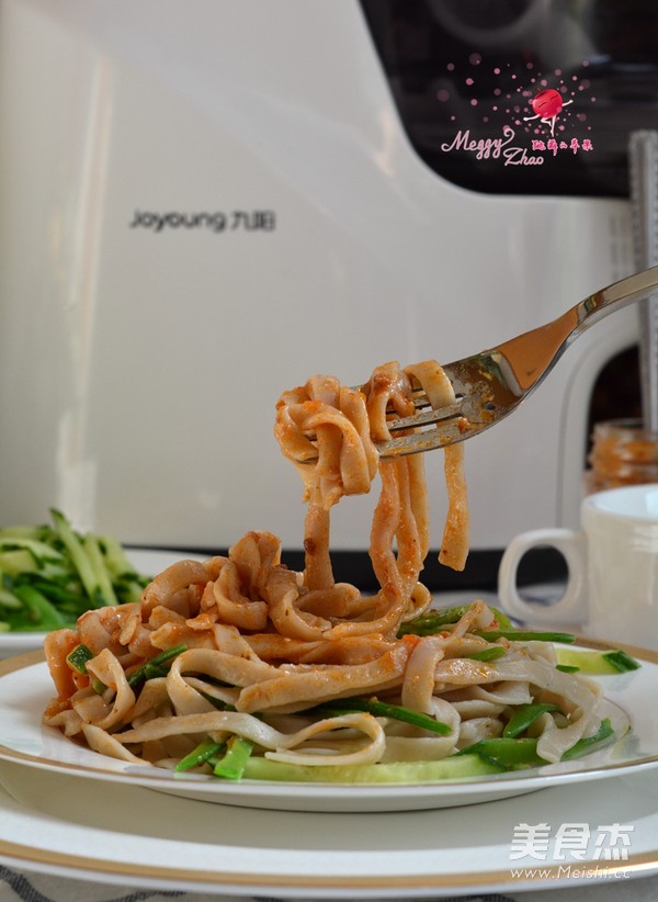 用外买的挂面或者切成也可以噢; 手工的压面机也能做出花式面条来; 经过高温水煮,火龙果皮中的花青素就消失了,但皮中的其它营养物质还在; 肉末意酱可以自己制作,也可以买现成的。