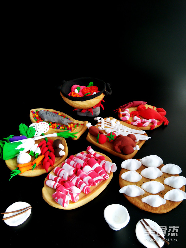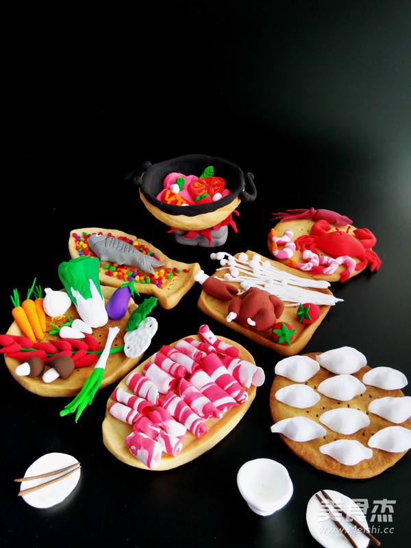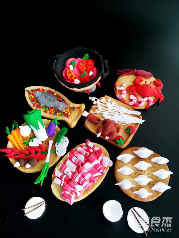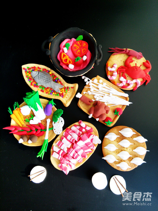 甜品也可以很有年味儿。。用黄油饼干做盘子和锅子,用翻糖做各种蔬菜和海鲜,是不是很有趣呢。。