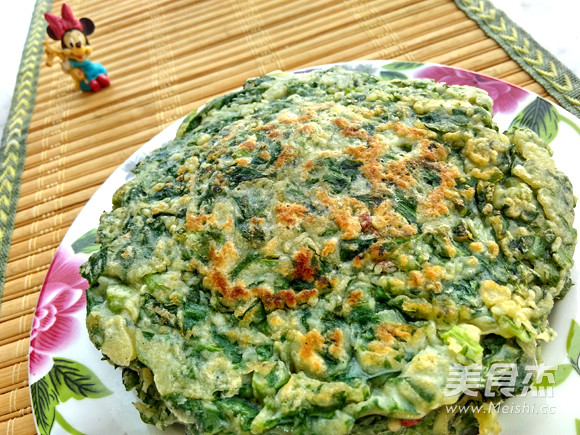 挖上一大勺,摊在锅中,待到表面渐渐凝固,颠勺,翻面,浅浅的金色。粉糊让茼蒿彼此连接,并赋予饼饼弹性的口感,而茼蒿则给饼饼予清香与青翠。。。。