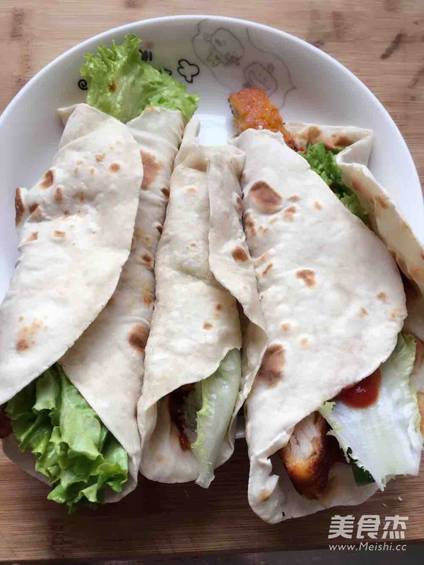 7.抹上黄豆酱,依次放上切好的黄瓜条,猪排,生菜叶,在生菜上再抹一层酱,卷起来即可。