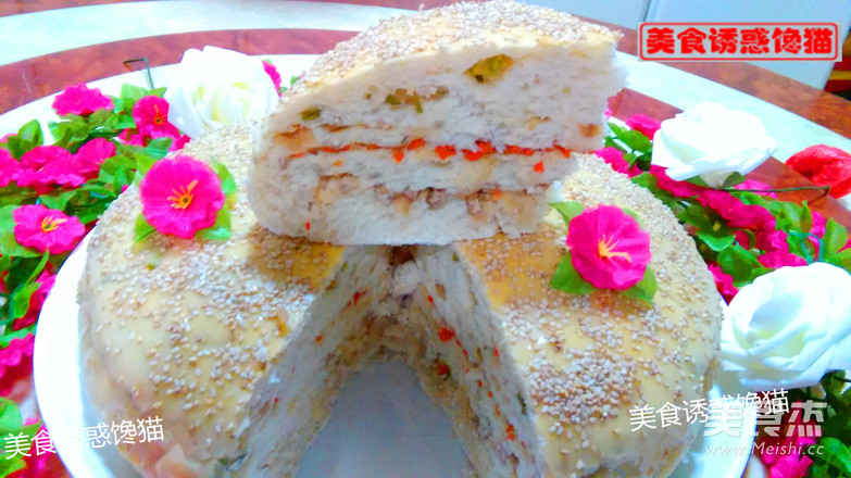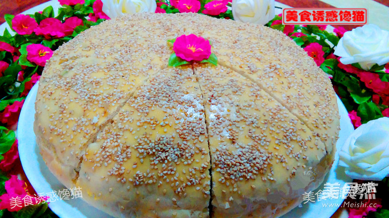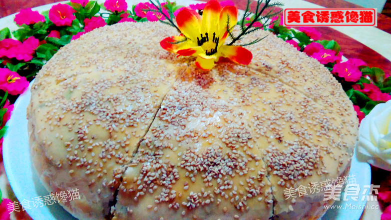 本款黄金千层饼,内夹香芋、胡萝卜、头菜、香葱,层层叠叠,口感丰富;外撒芝麻,酥香可口;外黄里暄,甜中带咸,咸里带鲜,食后令人口齿留香而不粘牙,是节日、待客的佳品。