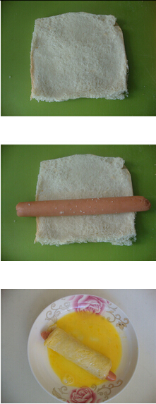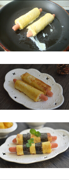 吐司热狗的材料:吐司2片,鸡蛋1个,海苔适量,火腿肠2个,盐 美食网 吐司热狗的做法: 1.吐司切掉四边,用擀面杖压实,卷入一个火腿肠, 2.鸡蛋打散,蛋液里加少许盐,将裹好火腿肠的吐司裹蛋液。 3.平底锅加少量色拉油煎至金黄色出锅,来点海苔装饰一下。