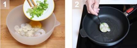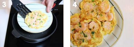 2.高火再油锅中加热适量,放入一勺虾和鸡蛋的混合物,煎至饼成型。重复此动作直到所有材料用完,即成。