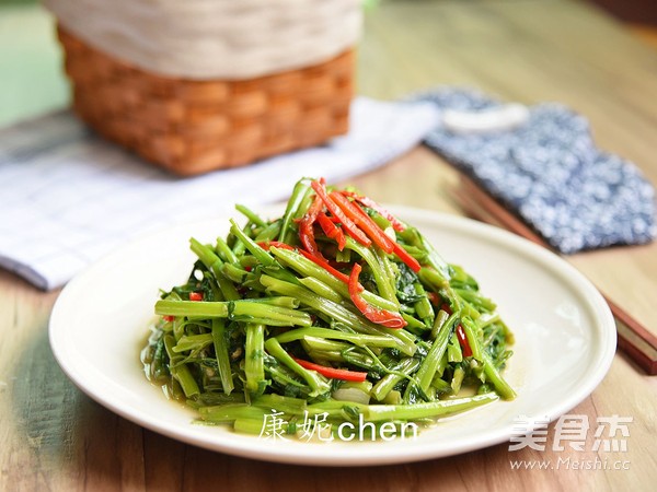 6.当通菜翻炒至七八成熟时,放入炒好的调料,翻炒几下,让调料混合均匀,可以根据口味放入少许盐即可盛碟上桌