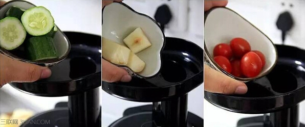 材料:桃子三个,圣女果少许,黄瓜两根 步骤: 1、将圣女果,黄瓜,桃子都洗干净,然后圣女果去蒂,黄瓜切段,桃子去核儿。 2、因为是混合果汁,启动原汁机后,三种果蔬可以混着放进去。 3、左边出渣,右边出汁啦 4、看一下最后的渣和汁,出汁率很高。原汁机的清洗也很方便,零部件拆开后一冲洗就好了,比传统榨汁机方便很多。 果汁榨好后就尽快喝吧。我一般喜欢把果汁倒进饮料瓶密封然后放冰箱里冰镇一下再喝,口感更好。但是新鲜果汁存放不了太久,最多到第二天就赶紧喝掉吧。