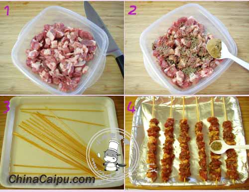 4:竹签事先泡水,可以避免烘烤的高温将其烤焦,而且烤好的肉也不会粘在竹签上;