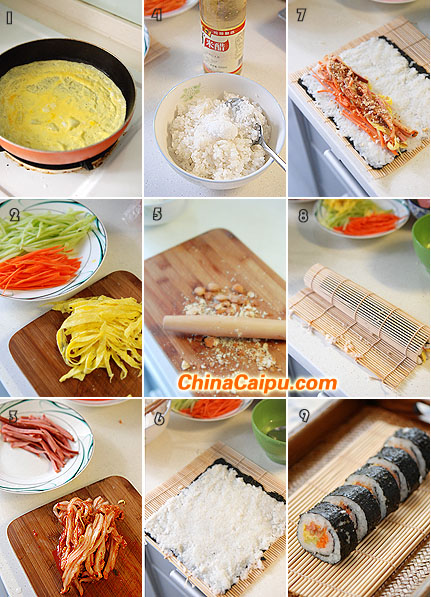 材料:米饭、黄瓜、胡萝卜、韩式泡菜、鸡蛋、火腿、杏仁,烤紫菜