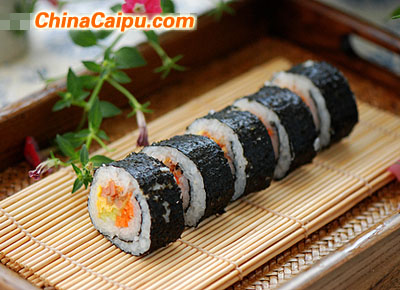 7、去掉竹帘,在干净的刀上沾水,将紫菜包饭切成合适的大小即成