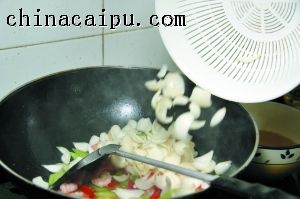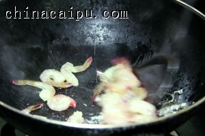3 烧热2汤匙油,倒入鲜虾仁滑炒至虾身蜷曲变红,盛起待用。