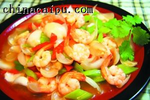材料:鲜基围虾(250克)、鲜百合(4只)、西芹(2根)、红椒(2只)、高汤(1/4杯)