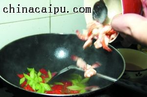5 倒入炒好的虾仁快速兜匀。