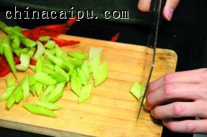 2 鲜百合取瓣洗净,沥干水待用;西芹撕去老筋,斜切成段,红椒切成菱形片。