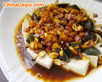 材料:嫩豆腐一块,皮蛋两个,花生适量;调料:味极鲜酱油一匙、糖少许、香醋一匙、辣椒油适量,洋葱碎少许。做法:1.嫩豆腐切小块,加少许盐和开水烫10分钟后,滤去水备用;2.皮蛋切小块放在豆腐上;3.花生用小火少油炒香,晾凉后擀碎倒在豆腐上面;4.取一小碗,加入所有调味料拌匀,浇在豆腐上面即可。提示:1.如能在超市买到黄飞鸿牌的麻辣花生,压碎浇在上面会更有味道。