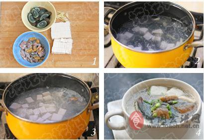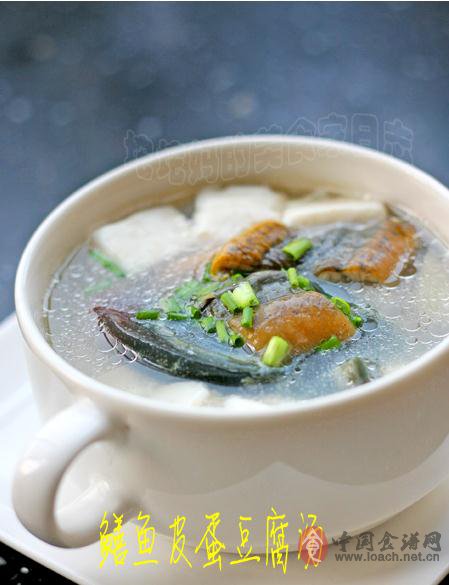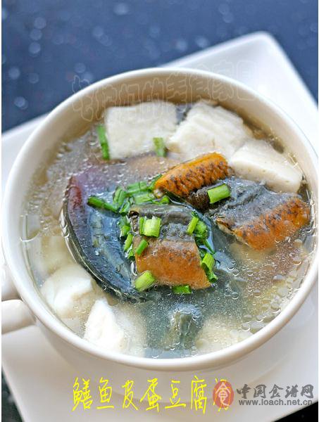 1.皮蛋两个切瓣,大鳝鱼两条去骨去肠洗净,改刀成片,加少量盐、料酒、生粉、蛋清拌匀,内脂豆腐半盒切成小块,生姜切成细丝;