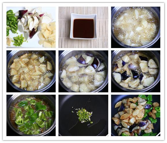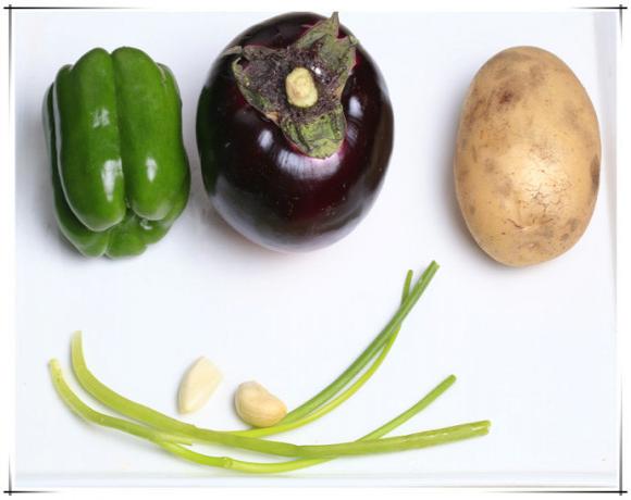 1、土豆去皮切成滚刀块、茄子留皮切滚刀块、柿子椒掰成块、葱切末、蒜切末